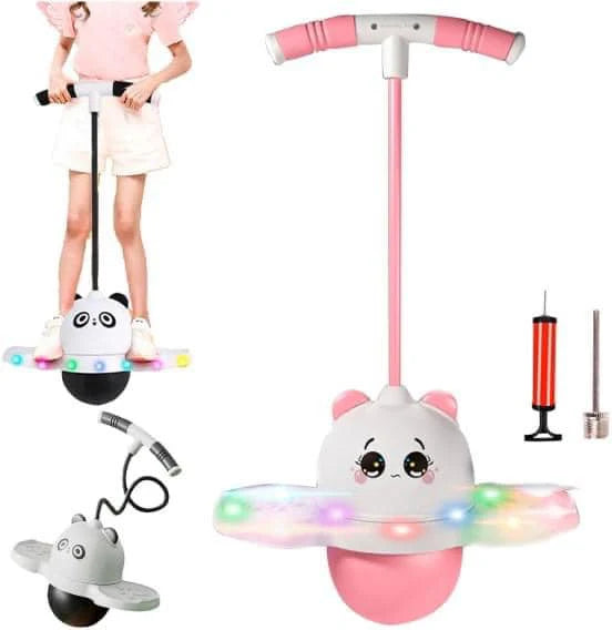 Construido con materiales seguros y duraderos, este juguete resiste cualquier aventura. La base robusta y manijas ergonómicas aseguran una experiencia segura en cada rebote.